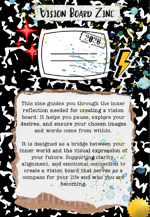 More than just blank pages, this zine offers gentle directions, thoughtful prompts, and creative suggestions to help you clarify what you want and why you want it. You’ll explore different areas of your life, uncover themes and feelings you want more of, and learn how to build a vision board that reflects both your goals and your values. Whether you’re cutting and pasting, sketching, or collecting words and images, this zine meets you wherever your creativity shows up.